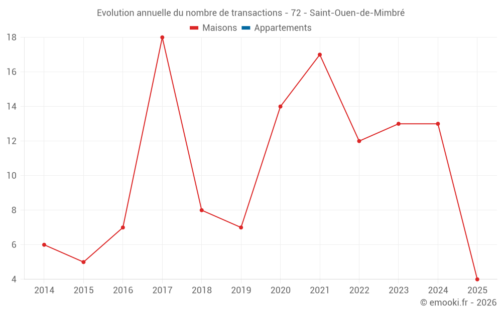 Le prix médian sur les 26 transactions de maisons des 24 derniers mois dans la commune de Saint-Ouen-de-Mimbré était de 1 201 € par mètre carré pour une valeur foncière médiane de 124 000 €. Sur cette période 60% des transactions se sont situées entre 843 et 1 864 € par mètre carré (du 2ème au 8ème déciles).