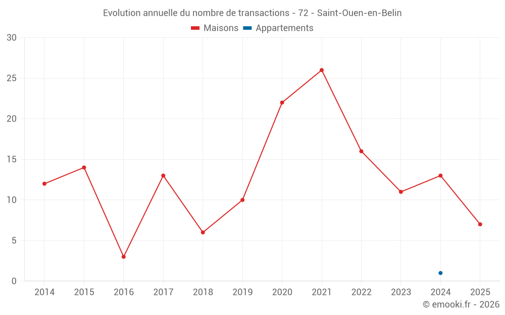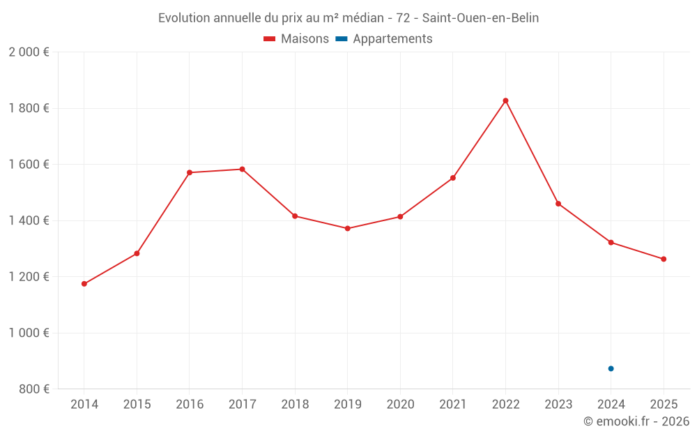 Le prix médian sur les 26 transactions de maisons des 24 derniers mois dans la commune de Saint-Ouen-en-Belin était de 1 313 € par mètre carré pour une valeur foncière médiane de 157 500 €. Sur cette période 60% des transactions se sont situées entre 957 et 1 667 € par mètre carré (du 2ème au 8ème déciles).