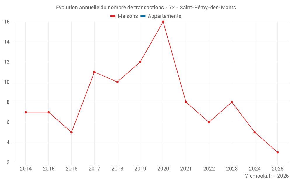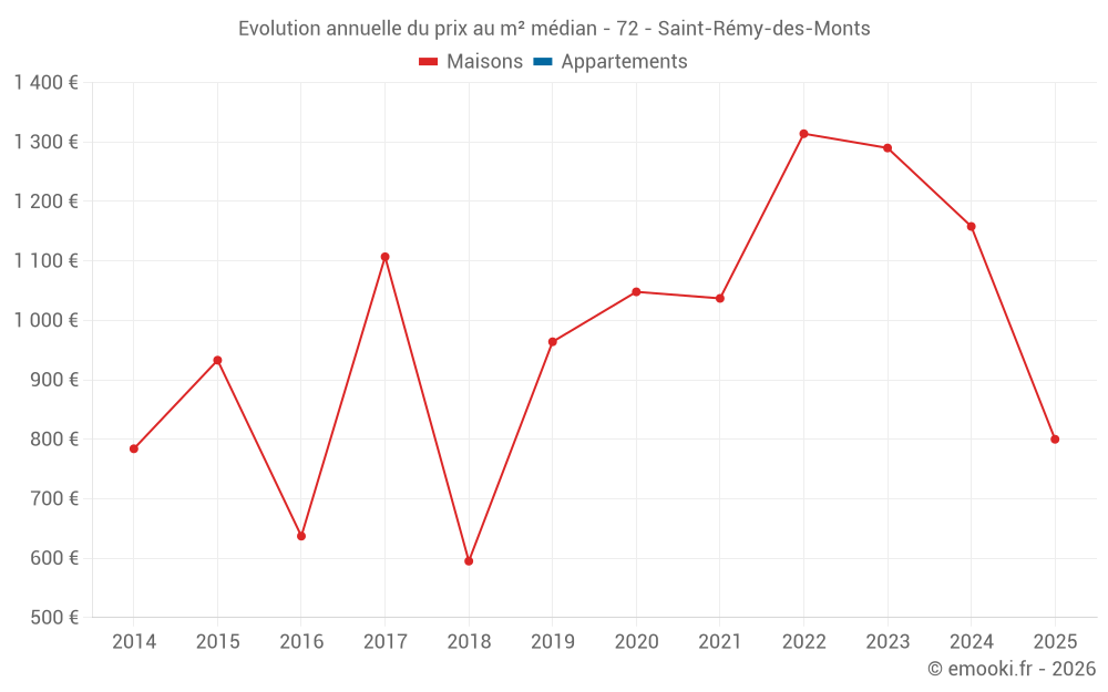 Le prix médian sur les 14 transactions de maisons des 24 derniers mois dans la commune de Saint-Rémy-des-Monts était de 1 090 € par mètre carré pour une valeur foncière médiane de 107 300 €. Sur cette période 60% des transactions se sont situées entre 766 et 1 476 € par mètre carré (du 2ème au 8ème déciles).