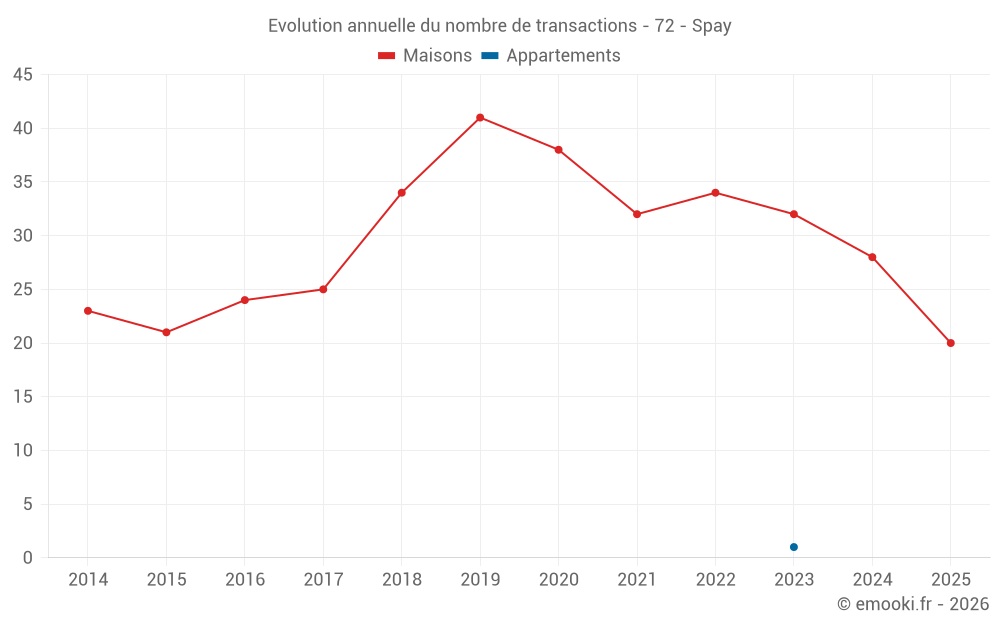 Le prix médian sur les 20 transactions de maisons des 6 derniers mois dans la commune de Spay était de 1 918 € par mètre carré pour une valeur foncière médiane de 192 000 €. Sur cette période 60% des transactions se sont situées entre 1 468 et 2 166 € par mètre carré (du 2ème au 8ème déciles).