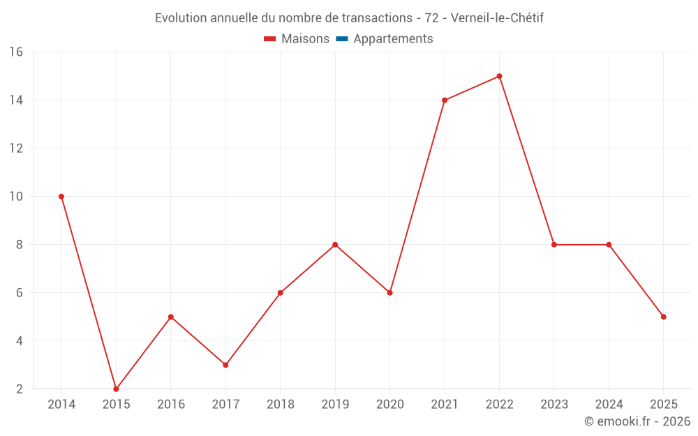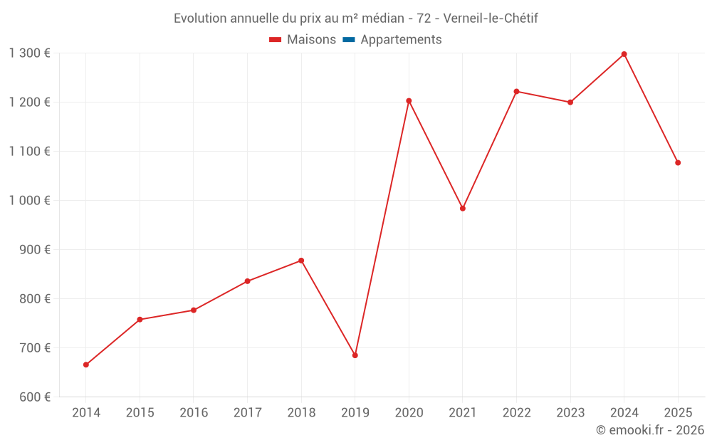 Le prix médian sur les 18 transactions de maisons des 24 derniers mois dans la commune de Verneil-le-Chétif était de 1 274 € par mètre carré pour une valeur foncière médiane de 120 750 €. Sur cette période 60% des transactions se sont situées entre 966 et 1 408 € par mètre carré (du 2ème au 8ème déciles).