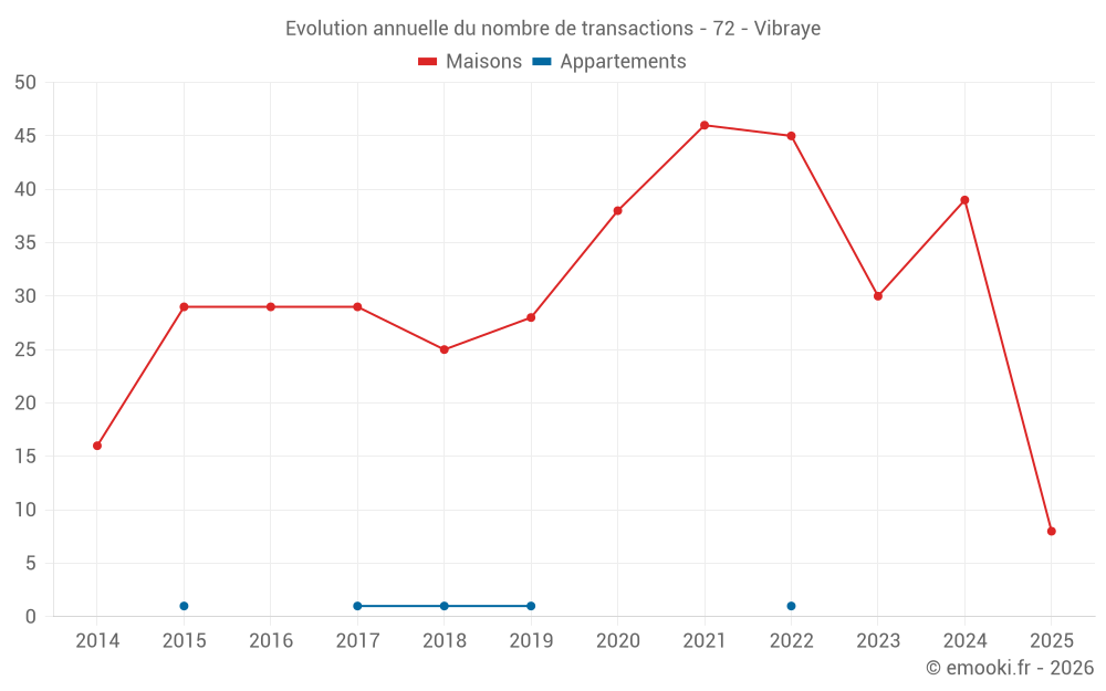 Le prix médian sur les 31 transactions de maisons des 12 derniers mois dans la commune de Vibraye était de 1 091 € par mètre carré pour une valeur foncière médiane de 92 680 €. Sur cette période 60% des transactions se sont situées entre 829 et 1 782 € par mètre carré (du 2ème au 8ème déciles).