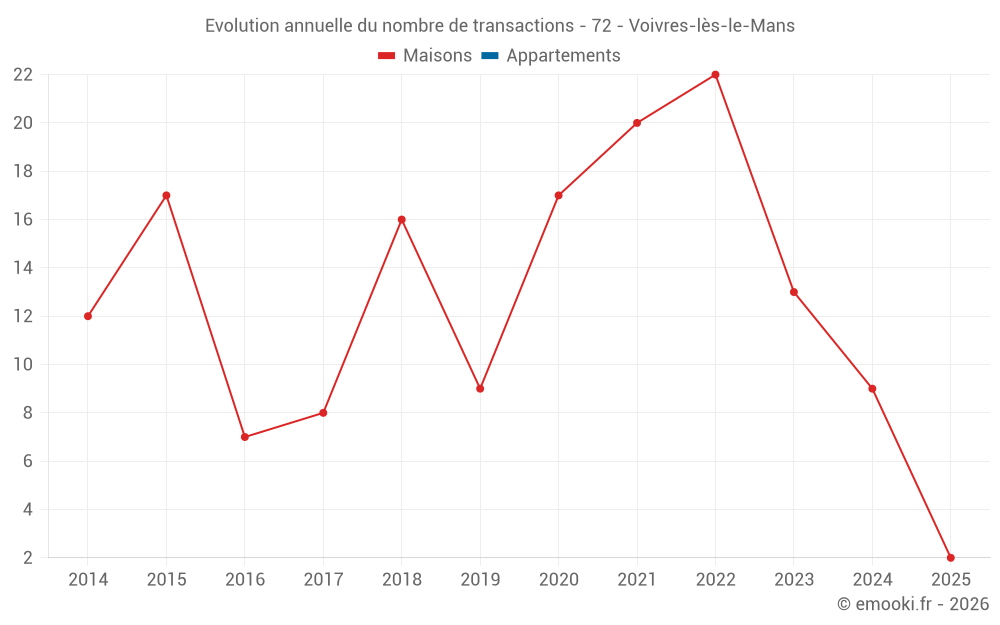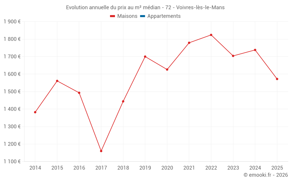 Le prix médian sur les 17 transactions de maisons des 24 derniers mois dans la commune de Voivres-lès-le-Mans était de 1 738 € par mètre carré pour une valeur foncière médiane de 203 000 €. Sur cette période 60% des transactions se sont situées entre 1 363 et 1 977 € par mètre carré (du 2ème au 8ème déciles).