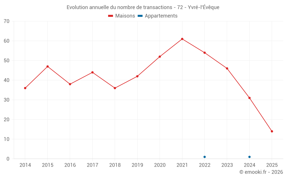 Le prix médian sur les 30 transactions de maisons des 12 derniers mois dans la commune d'Yvré-l'Évêque était de 1 925 € par mètre carré pour une valeur foncière médiane de 216 500 €. Sur cette période 60% des transactions se sont situées entre 1 434 et 2 428 € par mètre carré (du 2ème au 8ème déciles).