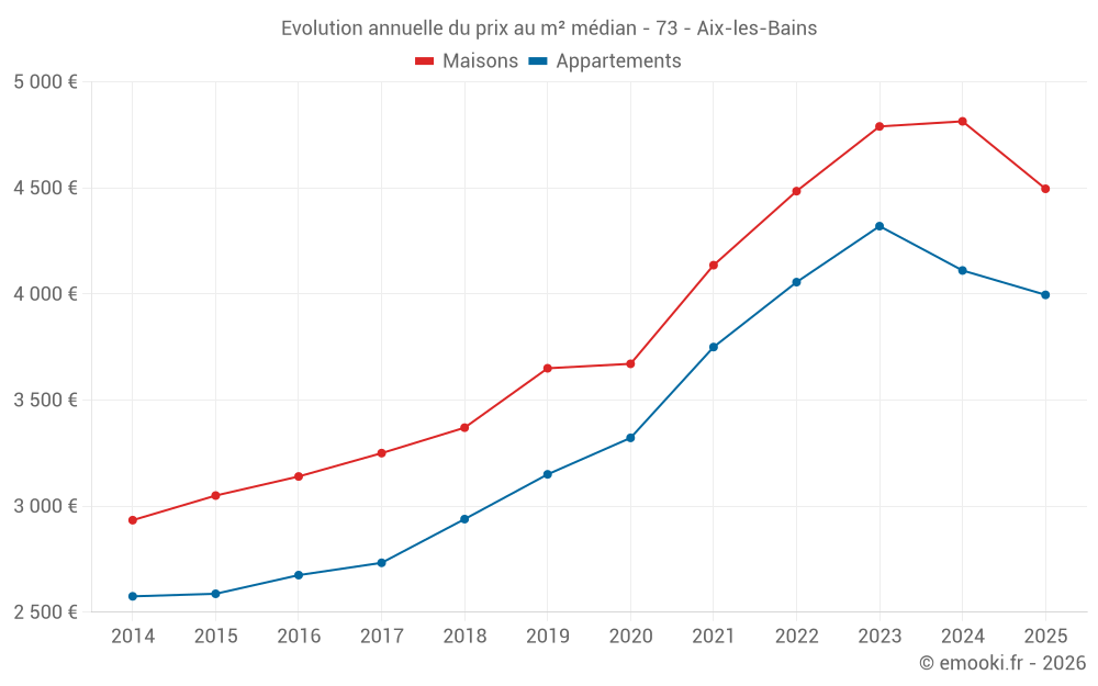 Le prix médian sur les 28 transactions de maisons des 3 derniers mois dans la commune d'Aix-les-Bains était de 4 534 € par mètre carré pour une valeur foncière médiane de 420 100 €. Sur cette période 60% des transactions se sont situées entre 3 196 et 5 426 € par mètre carré (du 2ème au 8ème déciles).