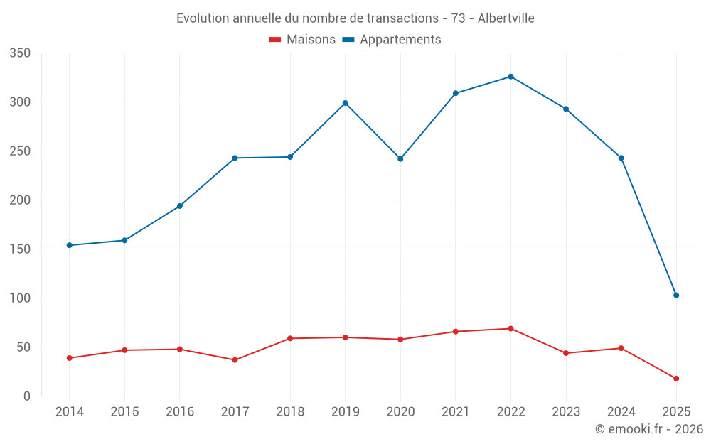 Le prix médian sur les 18 transactions de maisons des 6 derniers mois dans la commune d'Albertville était de 2 736 € par mètre carré pour une valeur foncière médiane de 269 000 €. Sur cette période 60% des transactions se sont situées entre 2 056 et 3 244 € par mètre carré (du 2ème au 8ème déciles).