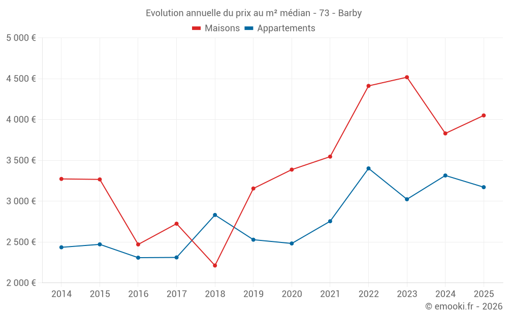 Le prix médian sur les 14 transactions de maisons des 24 derniers mois dans la commune de Barby était de 4 050 € par mètre carré pour une valeur foncière médiane de 366 500 €. Sur cette période 60% des transactions se sont situées entre 3 285 et 4 501 € par mètre carré (du 2ème au 8ème déciles).