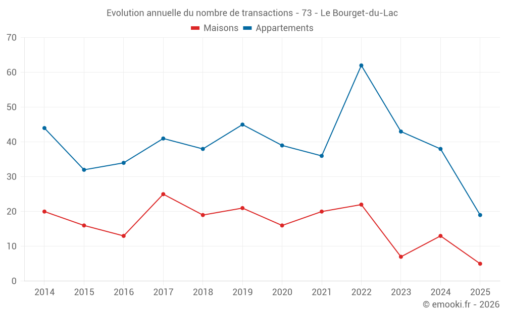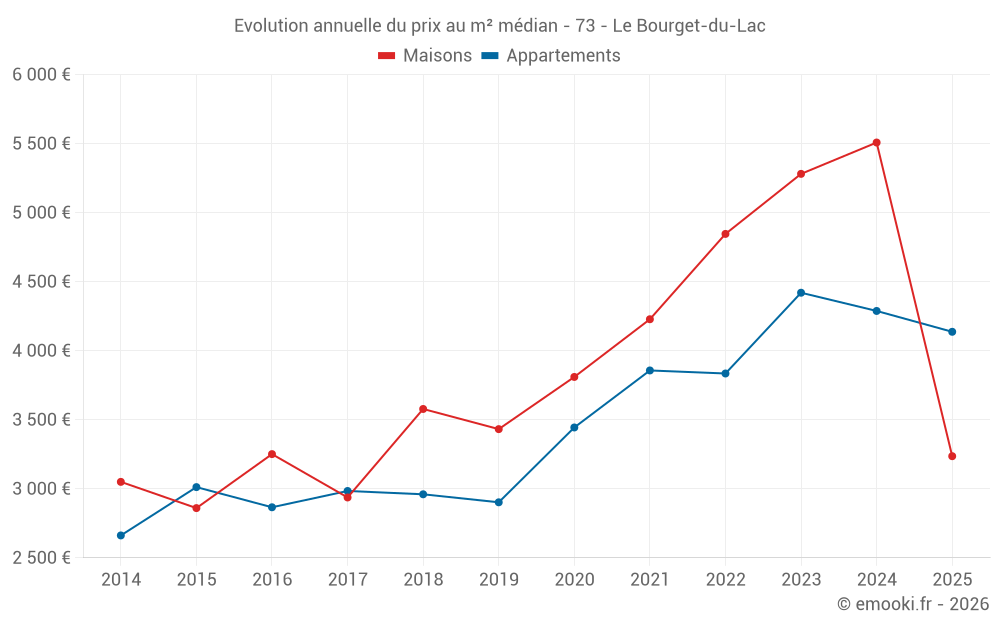 Le prix médian sur les 21 transactions de maisons des 24 derniers mois dans la commune du Bourget-du-Lac était de 4 173 € par mètre carré pour une valeur foncière médiane de 543 842 €. Sur cette période 60% des transactions se sont situées entre 3 236 et 6 250 € par mètre carré (du 2ème au 8ème déciles).