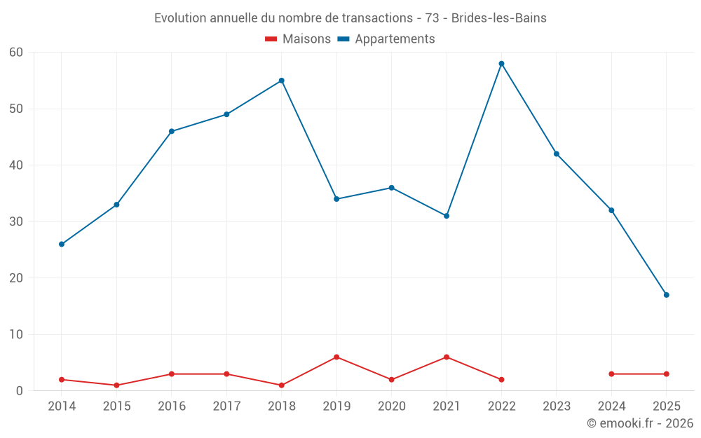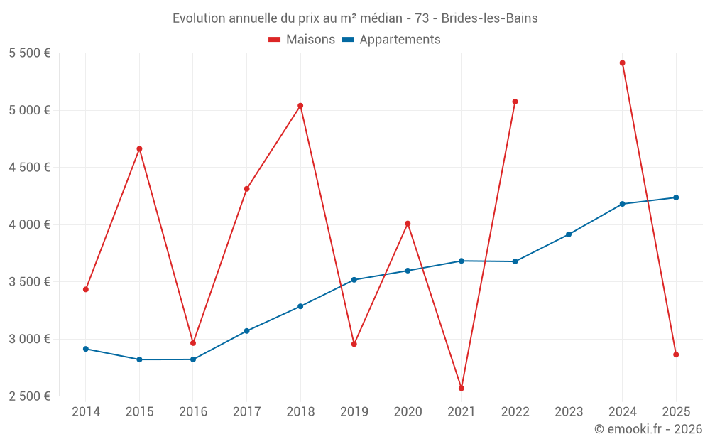 Le prix médian sur les 38 transactions d'appartements des 12 derniers mois dans la commune de Brides-les-Bains était de 4 222 € par mètre carré pour une valeur foncière médiane de 130 020 €. Sur cette période 60% des transactions se sont situées entre 3 720 et 5 026 € par mètre carré (du 2ème au 8ème déciles).