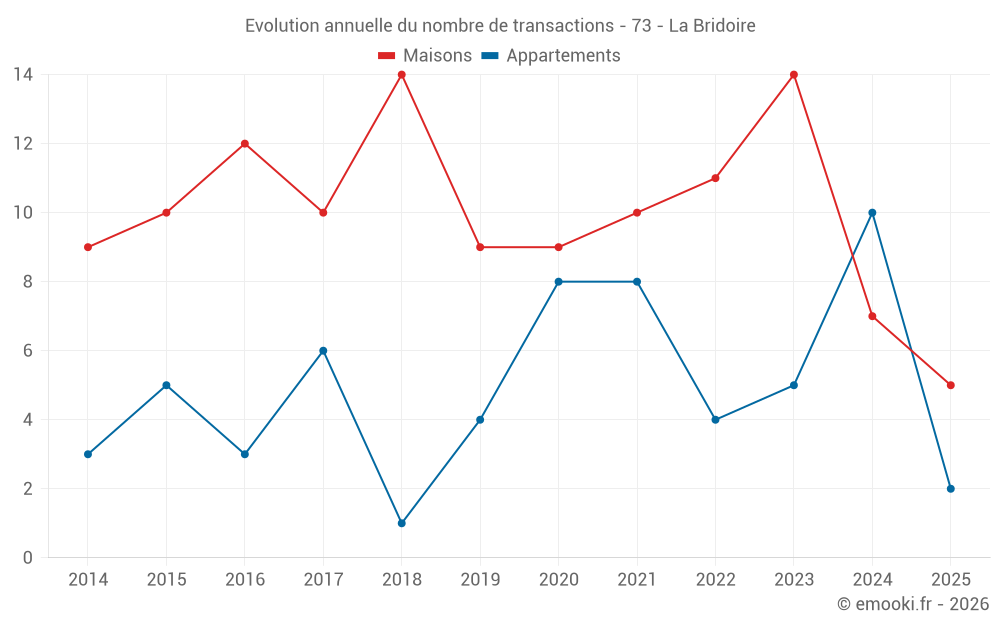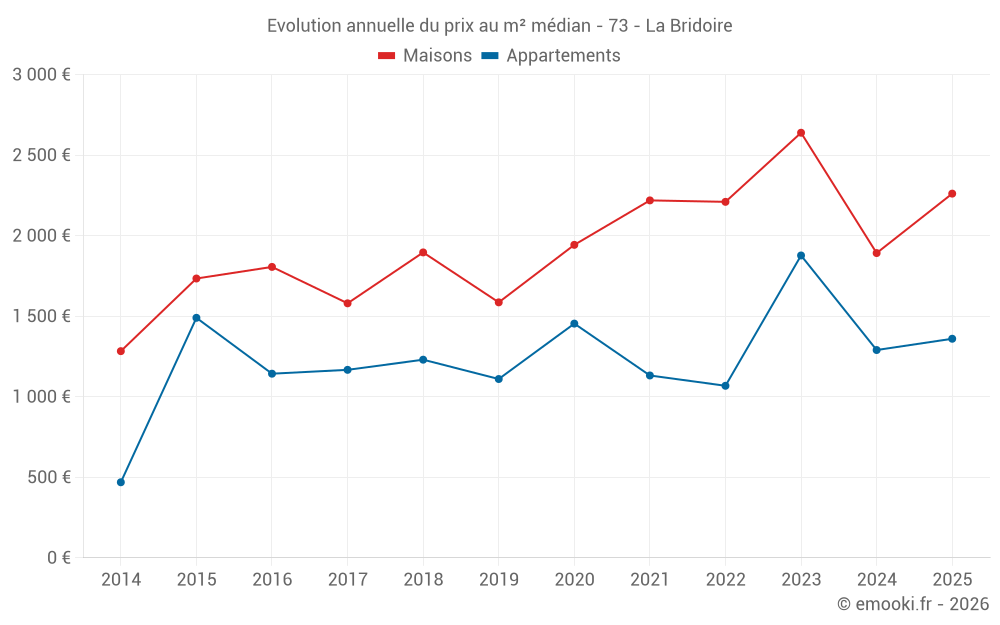 Le prix médian sur les 15 transactions d'appartements des 24 derniers mois dans la commune de la Bridoire était de 1 300 € par mètre carré pour une valeur foncière médiane de 96 100 €. Sur cette période 60% des transactions se sont situées entre 1 149 et 1 507 € par mètre carré (du 2ème au 8ème déciles).