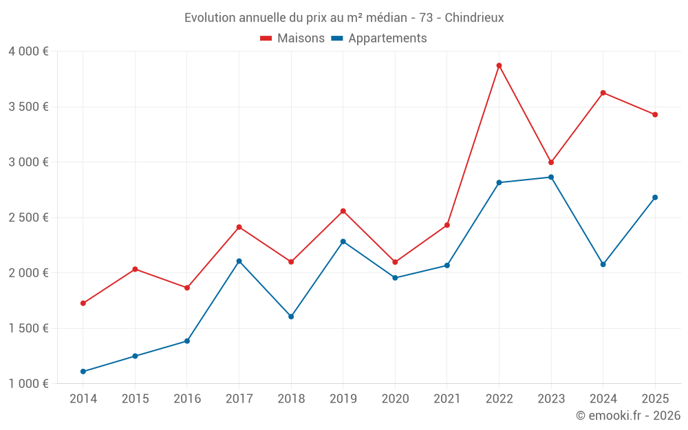 Le prix médian sur les 17 transactions de maisons des 12 derniers mois dans la commune de Chindrieux était de 3 429 € par mètre carré pour une valeur foncière médiane de 355 000 €. Sur cette période 60% des transactions se sont situées entre 2 287 et 5 005 € par mètre carré (du 2ème au 8ème déciles).