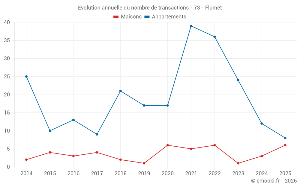 Le prix médian sur les 17 transactions d'appartements des 12 derniers mois dans la commune de Flumet était de 3 684 € par mètre carré pour une valeur foncière médiane de 110 000 €. Sur cette période 60% des transactions se sont situées entre 3 270 et 4 262 € par mètre carré (du 2ème au 8ème déciles).