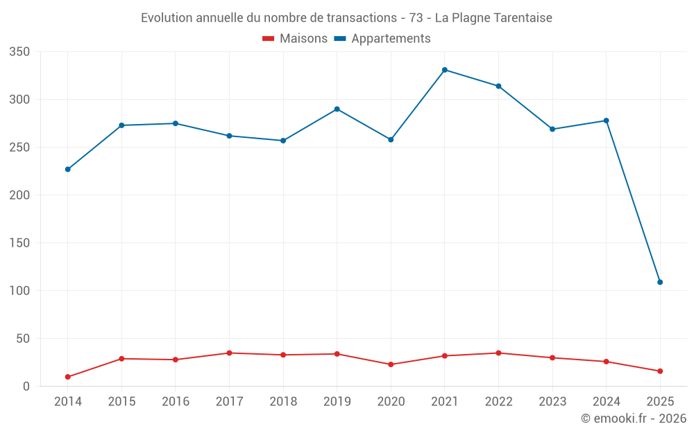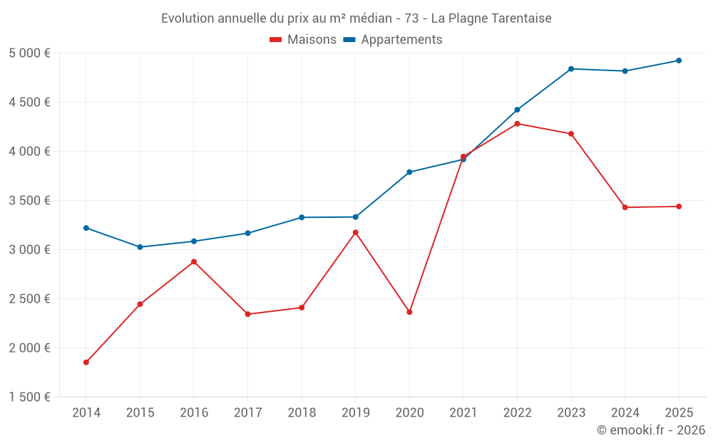Le prix médian sur les 31 transactions de maisons des 12 derniers mois dans la commune de la Plagne Tarentaise était de 3 262 € par mètre carré pour une valeur foncière médiane de 280 000 €. Sur cette période 60% des transactions se sont situées entre 1 638 et 5 000 € par mètre carré (du 2ème au 8ème déciles).