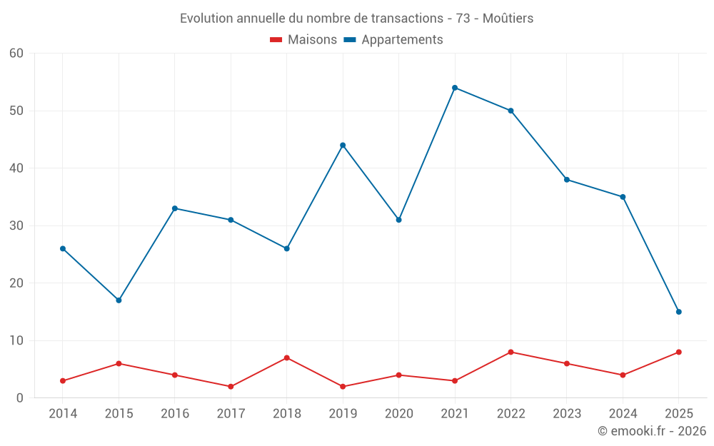 Le prix médian sur les 33 transactions d'appartements des 12 derniers mois dans la commune de Moûtiers était de 1 875 € par mètre carré pour une valeur foncière médiane de 104 000 €. Sur cette période 60% des transactions se sont situées entre 1 195 et 2 282 € par mètre carré (du 2ème au 8ème déciles).
