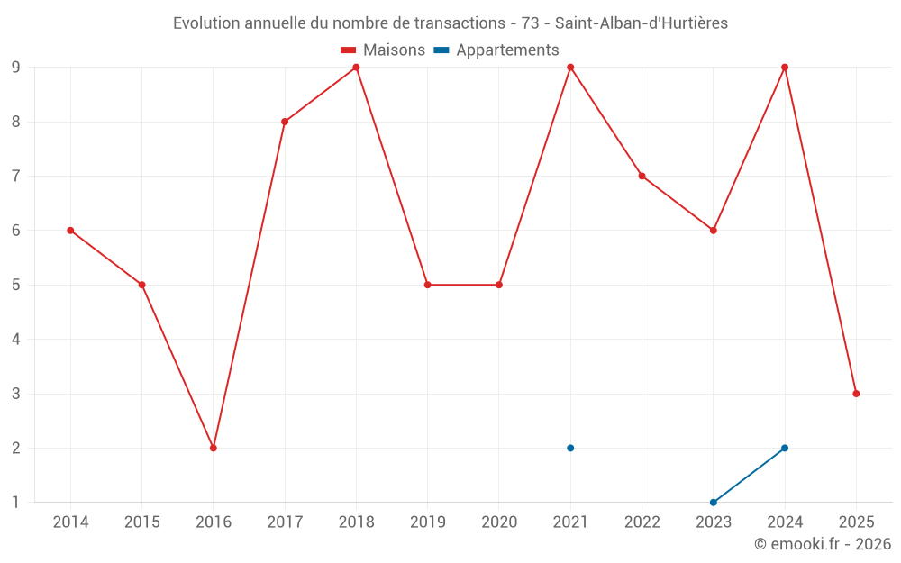 Le prix médian sur les 16 transactions de maisons des 24 derniers mois dans la commune de Saint-Alban-d'Hurtières était de 2 049 € par mètre carré pour une valeur foncière médiane de 145 480 €. Sur cette période 60% des transactions se sont situées entre 1 345 et 3 489 € par mètre carré (du 2ème au 8ème déciles).