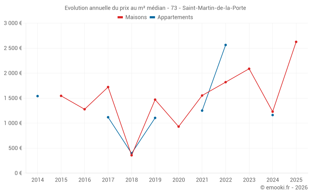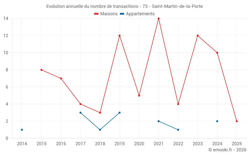 Le prix médian sur les 16 transactions de maisons des 24 derniers mois dans la commune de Saint-Martin-de-la-Porte était de 1 403 € par mètre carré pour une valeur foncière médiane de 102 600 €. Sur cette période 60% des transactions se sont situées entre 541 et 2 567 € par mètre carré (du 2ème au 8ème déciles).