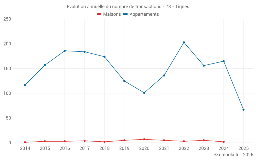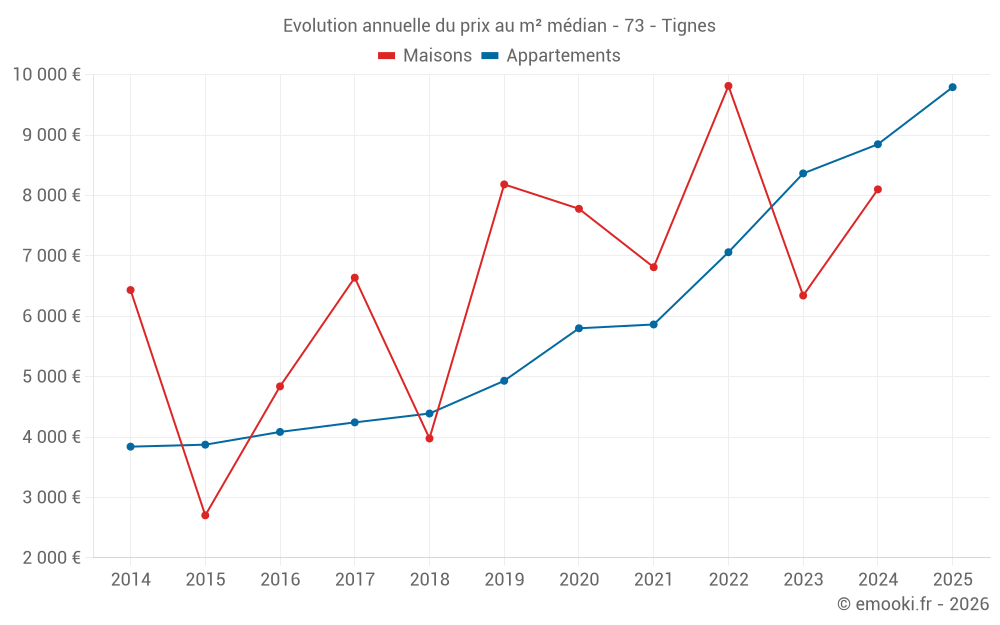 Le prix médian sur les 47 transactions d'appartements des 3 derniers mois dans la commune de Tignes était de 10 302 € par mètre carré pour une valeur foncière médiane de 372 910 €. Sur cette période 60% des transactions se sont situées entre 7 574 et 11 664 € par mètre carré (du 2ème au 8ème déciles).