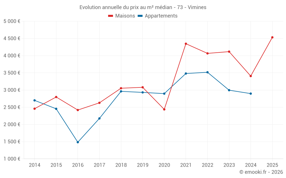 Le prix médian sur les 20 transactions de maisons des 24 derniers mois dans la commune de Vimines était de 4 113 € par mètre carré pour une valeur foncière médiane de 439 875 €. Sur cette période 60% des transactions se sont situées entre 3 376 et 4 603 € par mètre carré (du 2ème au 8ème déciles).