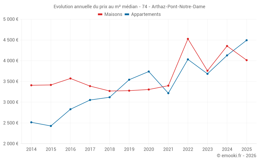 Le prix médian sur les 18 transactions de maisons des 24 derniers mois dans la commune d'Arthaz-Pont-Notre-Dame était de 4 116 € par mètre carré pour une valeur foncière médiane de 453 175 €. Sur cette période 60% des transactions se sont situées entre 3 397 et 5 056 € par mètre carré (du 2ème au 8ème déciles).