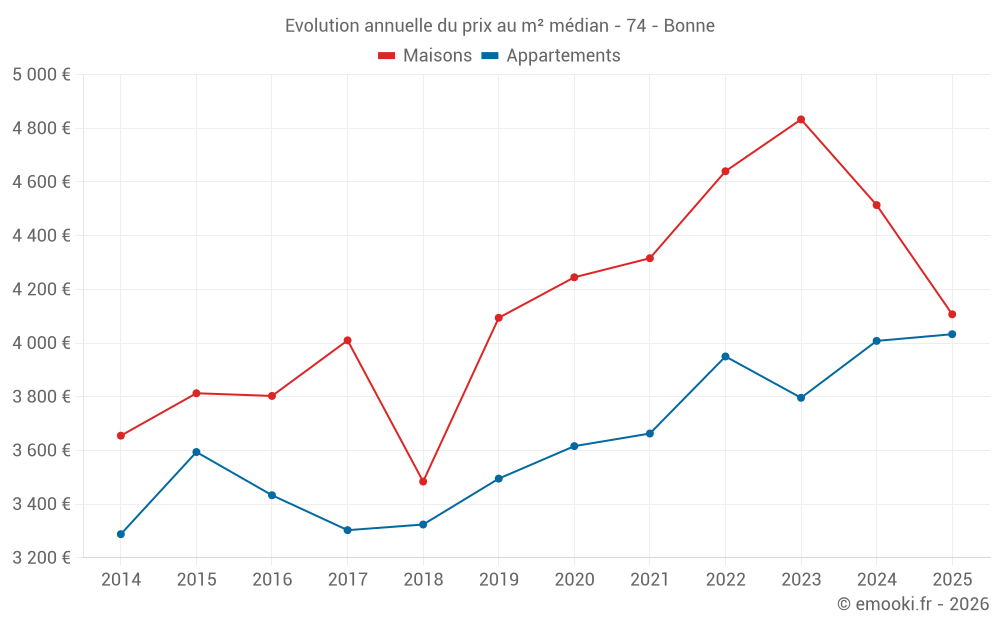 Le prix médian sur les 18 transactions d'appartements des 12 derniers mois dans la commune de Bonne était de 4 038 € par mètre carré pour une valeur foncière médiane de 277 738 €. Sur cette période 60% des transactions se sont situées entre 3 595 et 4 463 € par mètre carré (du 2ème au 8ème déciles).
