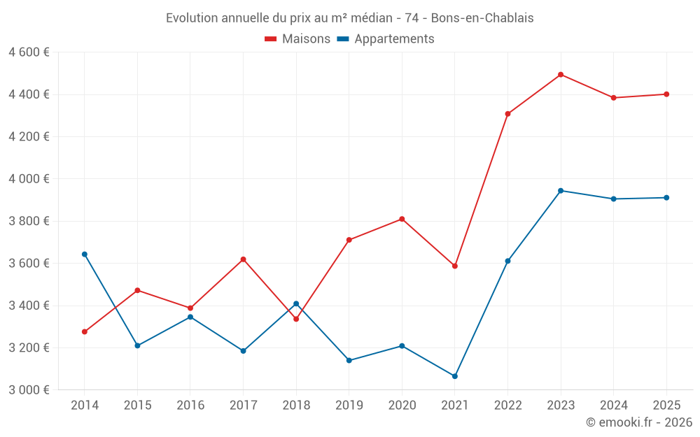 Le prix médian sur les 26 transactions de maisons des 12 derniers mois dans la commune de Bons-en-Chablais était de 4 401 € par mètre carré pour une valeur foncière médiane de 436 080 €. Sur cette période 60% des transactions se sont situées entre 2 857 et 4 826 € par mètre carré (du 2ème au 8ème déciles).