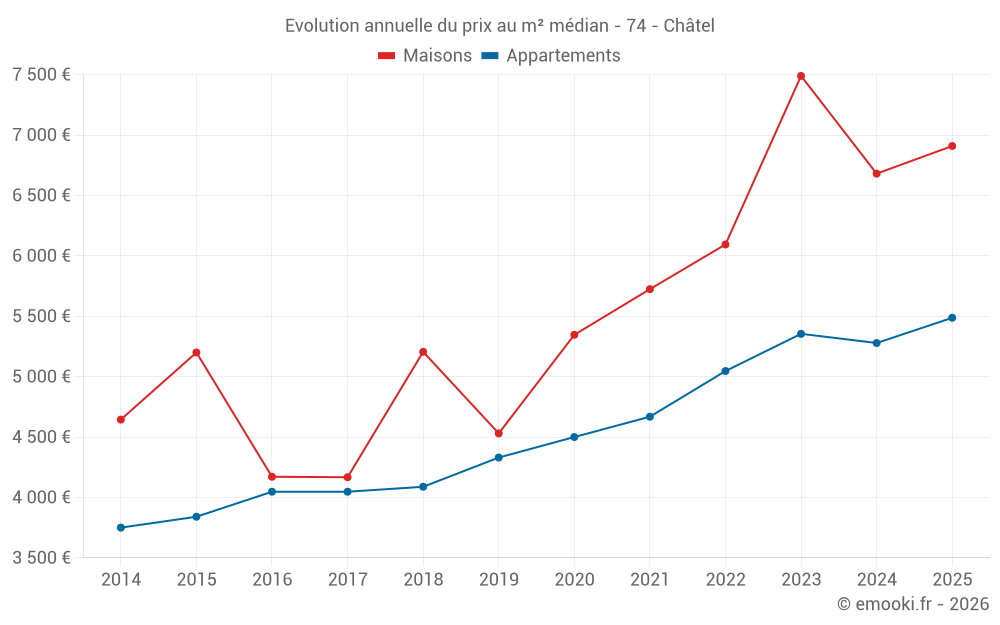 Le prix médian sur les 30 transactions de maisons des 24 derniers mois dans la commune de Châtel était de 6 882 € par mètre carré pour une valeur foncière médiane de 695 000 €. Sur cette période 60% des transactions se sont situées entre 5 460 et 9 151 € par mètre carré (du 2ème au 8ème déciles).