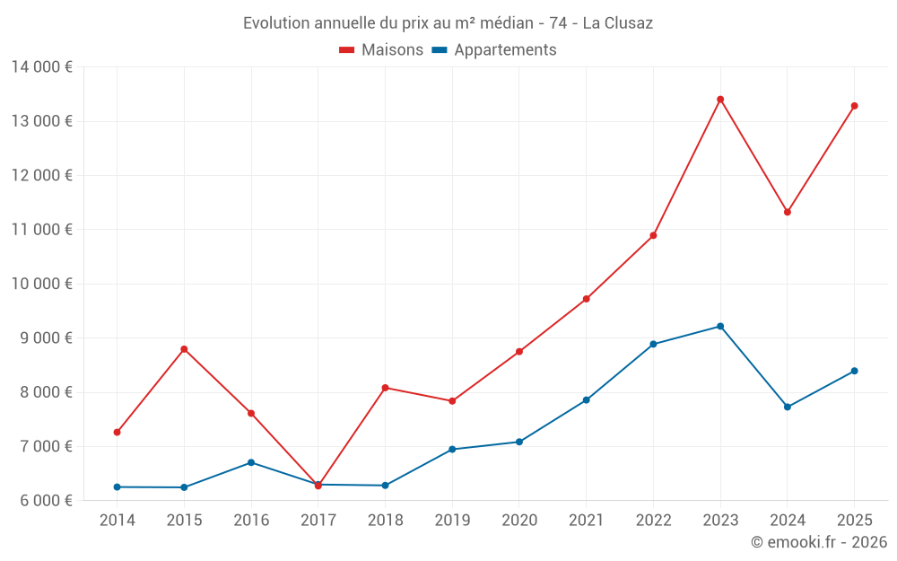 Le prix médian sur les 28 transactions de maisons des 24 derniers mois dans la commune de la Clusaz était de 13 070 € par mètre carré pour une valeur foncière médiane de 1 271 625 €. Sur cette période 60% des transactions se sont situées entre 7 733 et 15 352 € par mètre carré (du 2ème au 8ème déciles).