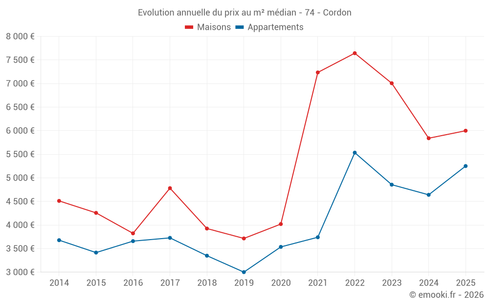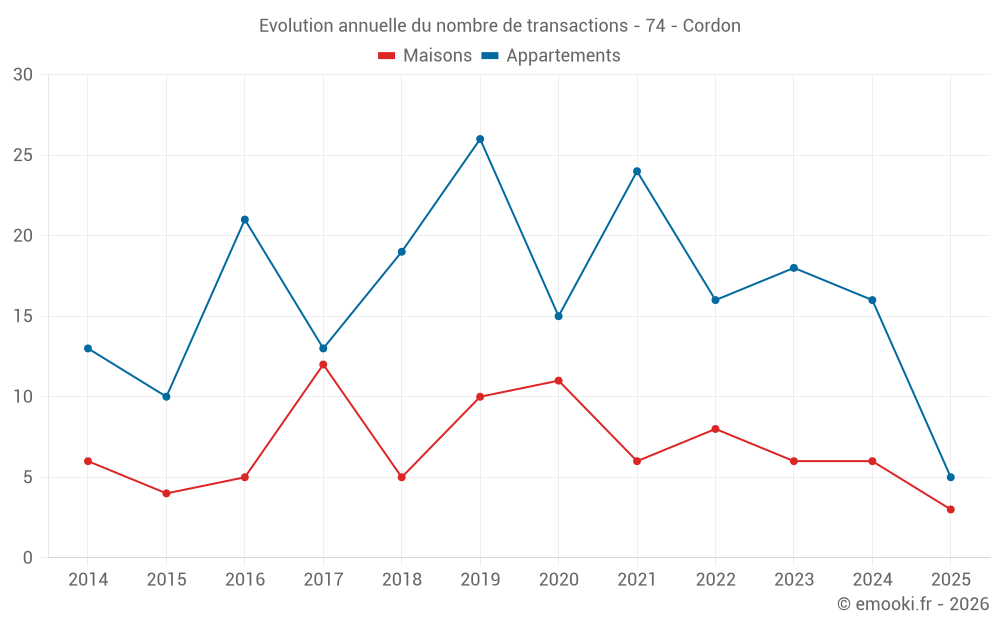 Le prix médian sur les 32 transactions d'appartements des 24 derniers mois dans la commune de Cordon était de 4 720 € par mètre carré pour une valeur foncière médiane de 193 700 €. Sur cette période 60% des transactions se sont situées entre 3 663 et 6 153 € par mètre carré (du 2ème au 8ème déciles).