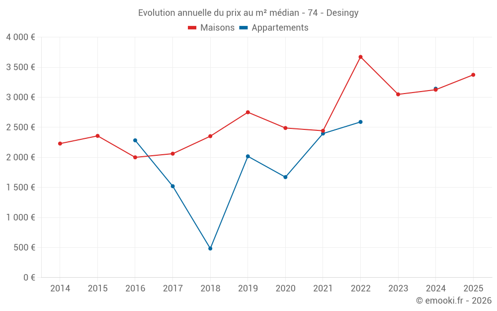 Le prix médian sur les 17 transactions de maisons des 24 derniers mois dans la commune de Desingy était de 3 358 € par mètre carré pour une valeur foncière médiane de 290 000 €. Sur cette période 60% des transactions se sont situées entre 2 534 et 4 257 € par mètre carré (du 2ème au 8ème déciles).