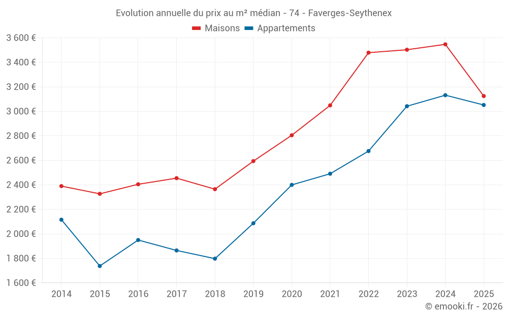 Le prix médian sur les 22 transactions de maisons des 12 derniers mois dans la commune de Faverges-Seythenex était de 3 316 € par mètre carré pour une valeur foncière médiane de 308 631 €. Sur cette période 60% des transactions se sont situées entre 1 809 et 4 253 € par mètre carré (du 2ème au 8ème déciles).