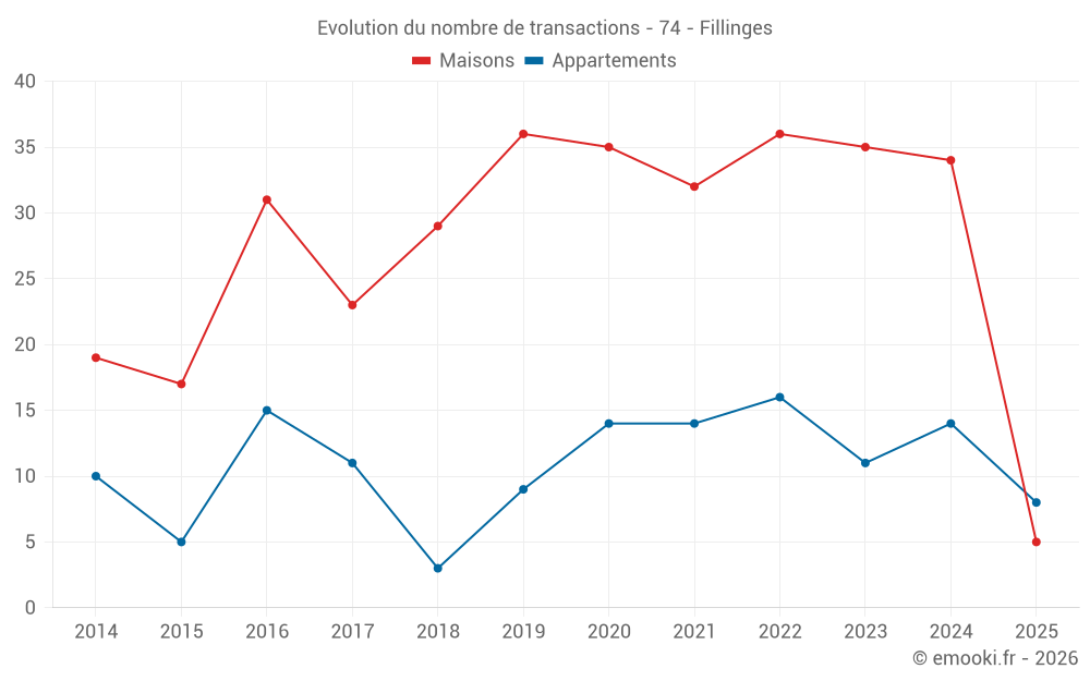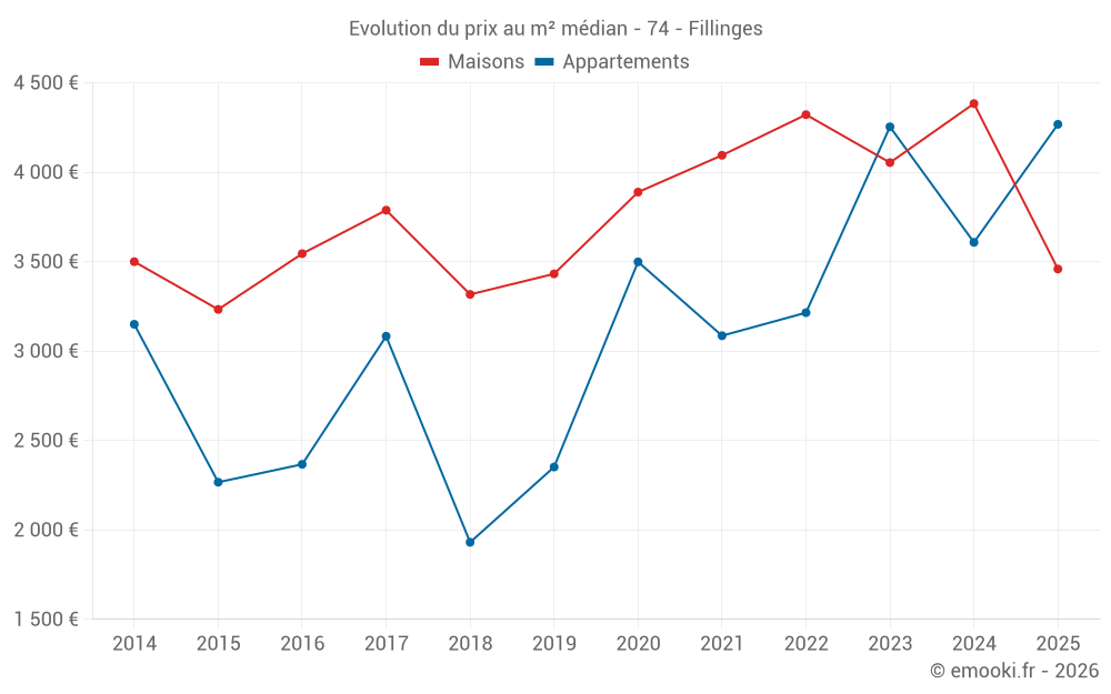 Le prix médian sur les 25 transactions de maisons des 12 derniers mois dans la commune de Fillinges était de 4 092 € par mètre carré pour une valeur foncière médiane de 436 000 €. Sur cette période 60% des transactions se sont situées entre 3 085 et 5 344 € par mètre carré (du 2ème au 8ème déciles).