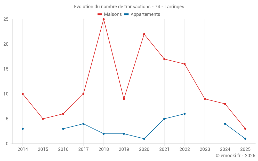 Le prix médian sur les 14 transactions de maisons des 24 derniers mois dans la commune de Larringes était de 3 994 € par mètre carré pour une valeur foncière médiane de 436 500 €. Sur cette période 60% des transactions se sont situées entre 3 214 et 5 524 € par mètre carré (du 2ème au 8ème déciles).