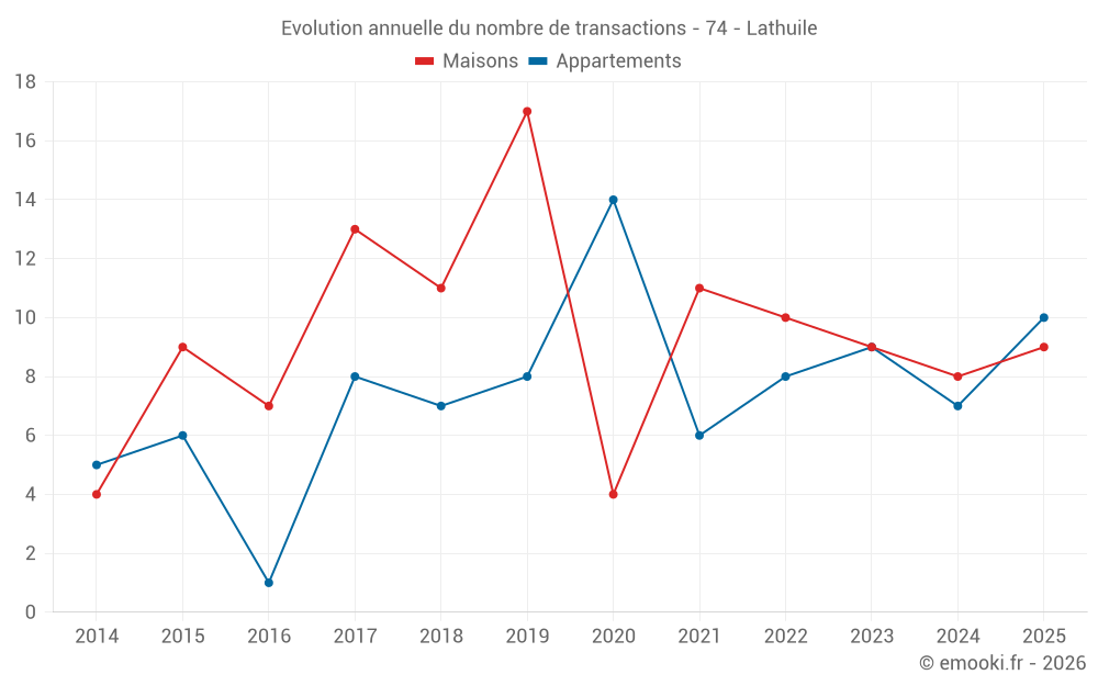 Le prix médian sur les 17 transactions d'appartements des 24 derniers mois dans la commune de Lathuile était de 4 545 € par mètre carré pour une valeur foncière médiane de 320 400 €. Sur cette période 60% des transactions se sont situées entre 4 004 et 5 137 € par mètre carré (du 2ème au 8ème déciles).
