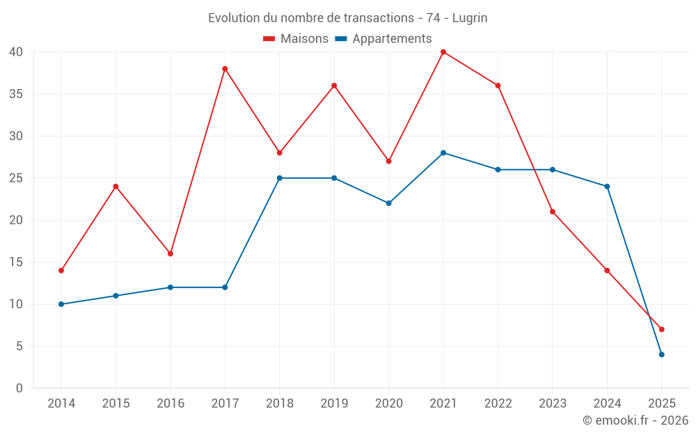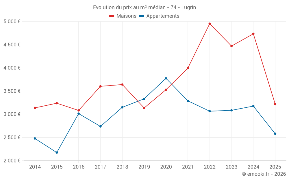 Le prix médian sur les 36 transactions de maisons des 24 derniers mois dans la commune de Lugrin était de 4 247 € par mètre carré pour une valeur foncière médiane de 573 750 €. Sur cette période 60% des transactions se sont situées entre 3 219 et 5 132 € par mètre carré (du 2ème au 8ème déciles).