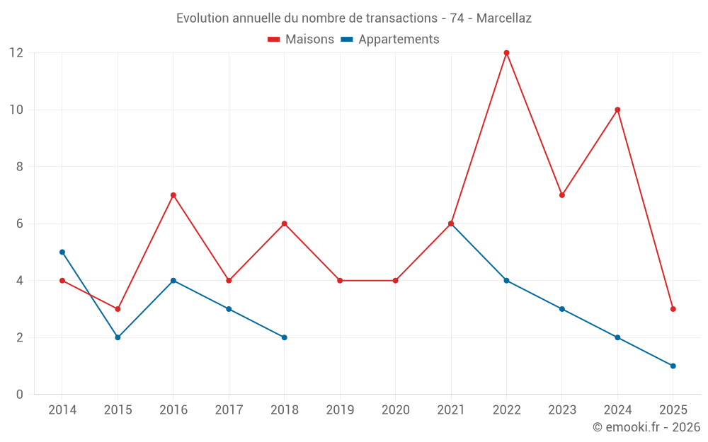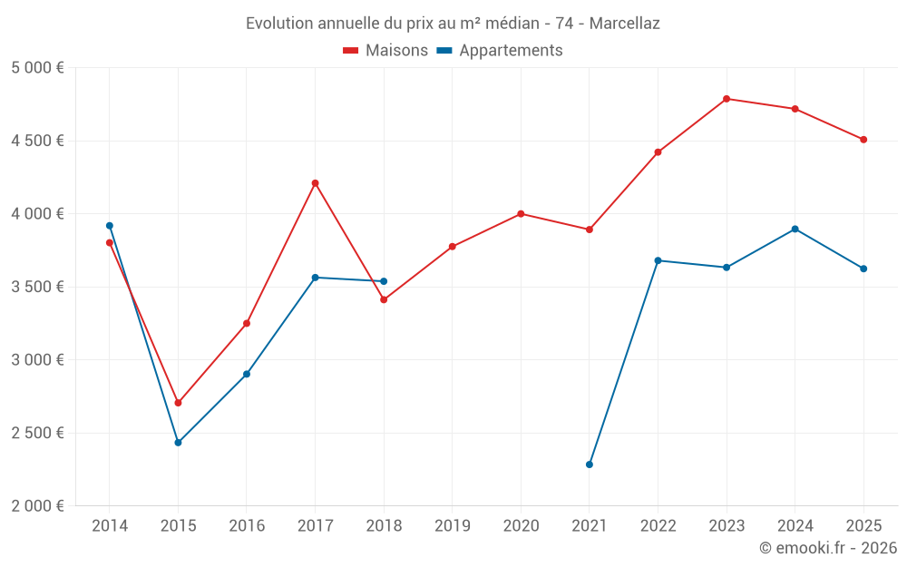 Le prix médian sur les 17 transactions de maisons des 24 derniers mois dans la commune de Marcellaz était de 4 938 € par mètre carré pour une valeur foncière médiane de 512 900 €. Sur cette période 60% des transactions se sont situées entre 3 631 et 5 546 € par mètre carré (du 2ème au 8ème déciles).