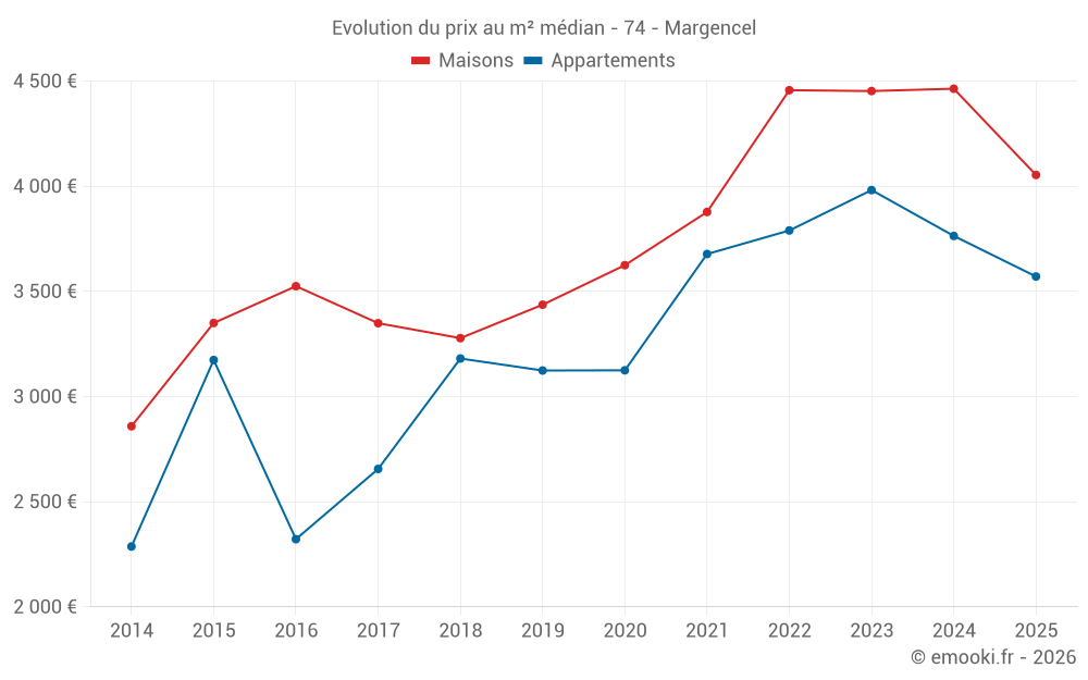 Le prix médian sur les 40 transactions de maisons des 24 derniers mois dans la commune de Margencel était de 4 478 € par mètre carré pour une valeur foncière médiane de 395 700 €. Sur cette période 60% des transactions se sont situées entre 3 644 et 5 407 € par mètre carré (du 2ème au 8ème déciles).
