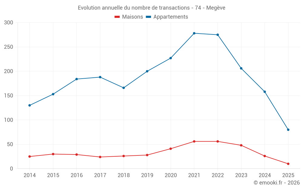 Le prix médian sur les 25 transactions de maisons des 12 derniers mois dans la commune de Megève était de 15 679 € par mètre carré pour une valeur foncière médiane de 1 904 000 €. Sur cette période 60% des transactions se sont situées entre 8 098 et 24 014 € par mètre carré (du 2ème au 8ème déciles).