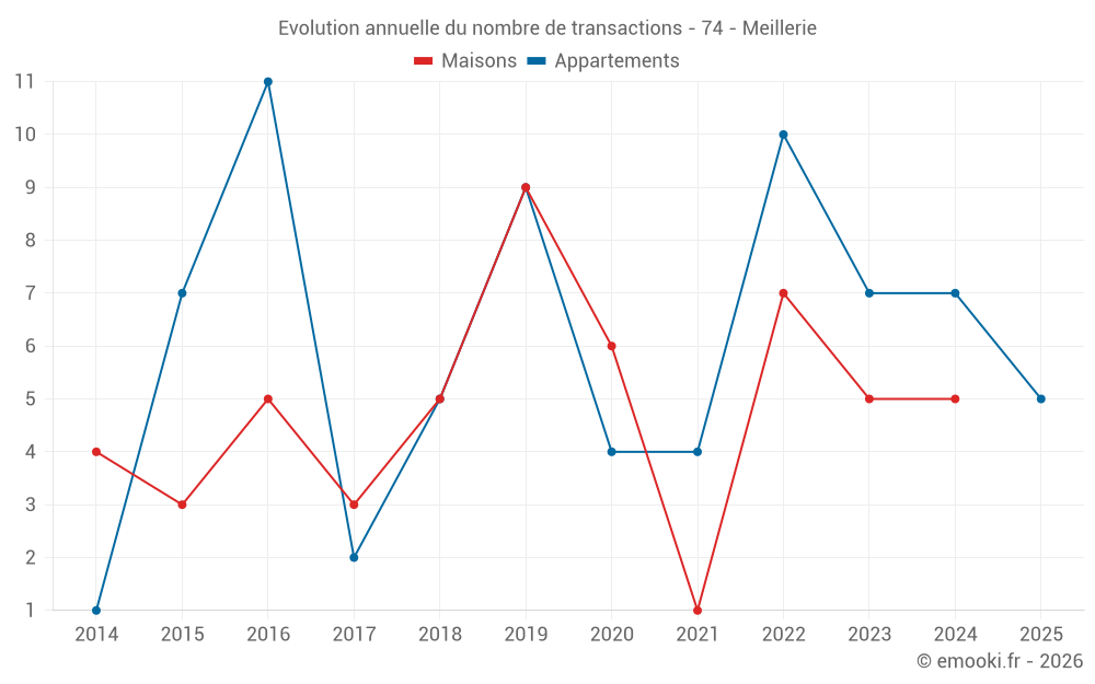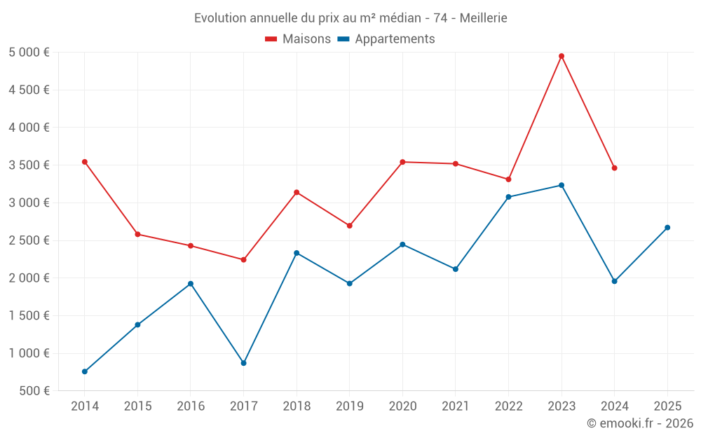 Le prix médian sur les 14 transactions d'appartements des 24 derniers mois dans la commune de Meillerie était de 2 694 € par mètre carré pour une valeur foncière médiane de 208 000 €. Sur cette période 60% des transactions se sont situées entre 1 837 et 3 312 € par mètre carré (du 2ème au 8ème déciles).