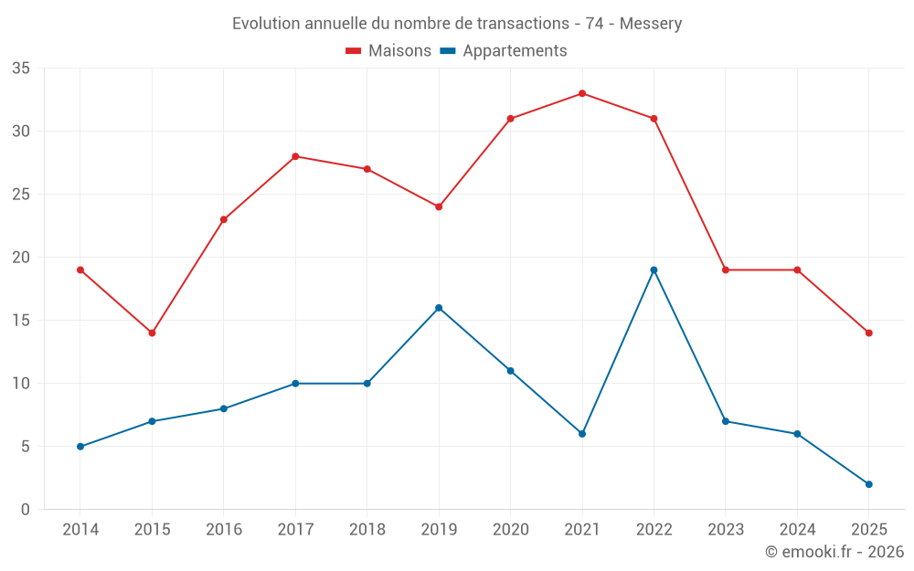 Le prix médian sur les 26 transactions de maisons des 12 derniers mois dans la commune de Messery était de 4 692 € par mètre carré pour une valeur foncière médiane de 415 100 €. Sur cette période 60% des transactions se sont situées entre 3 525 et 6 190 € par mètre carré (du 2ème au 8ème déciles).