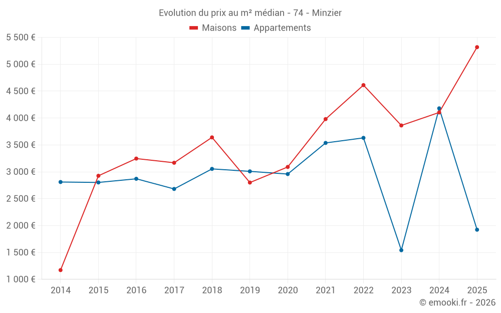 Le prix médian sur les 18 transactions de maisons des 24 derniers mois dans la commune de Minzier était de 4 104 € par mètre carré pour une valeur foncière médiane de 448 850 €. Sur cette période 60% des transactions se sont situées entre 3 053 et 5 312 € par mètre carré (du 2ème au 8ème déciles).