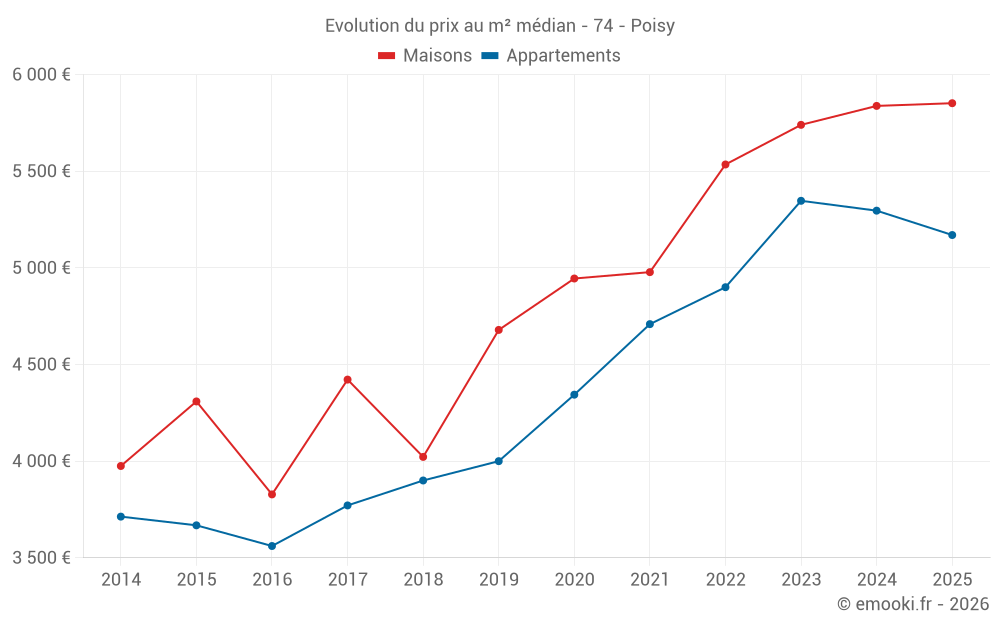 Le prix médian sur les 29 transactions de maisons des 12 derniers mois dans la commune de Poisy était de 5 733 € par mètre carré pour une valeur foncière médiane de 632 000 €. Sur cette période 60% des transactions se sont situées entre 4 307 et 6 396 € par mètre carré (du 2ème au 8ème déciles).