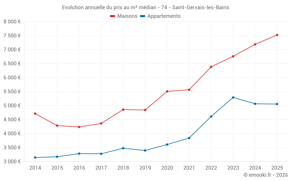 Le prix médian sur les 22 transactions de maisons des 6 derniers mois dans la commune de Saint-Gervais-les-Bains était de 7 522 € par mètre carré pour une valeur foncière médiane de 979 925 €. Sur cette période 60% des transactions se sont situées entre 5 428 et 9 982 € par mètre carré (du 2ème au 8ème déciles).