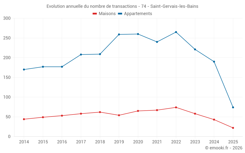Le prix médian sur les 27 transactions d'appartements des 3 derniers mois dans la commune de Saint-Gervais-les-Bains était de 5 058 € par mètre carré pour une valeur foncière médiane de 245 000 €. Sur cette période 60% des transactions se sont situées entre 4 611 et 6 125 € par mètre carré (du 2ème au 8ème déciles).