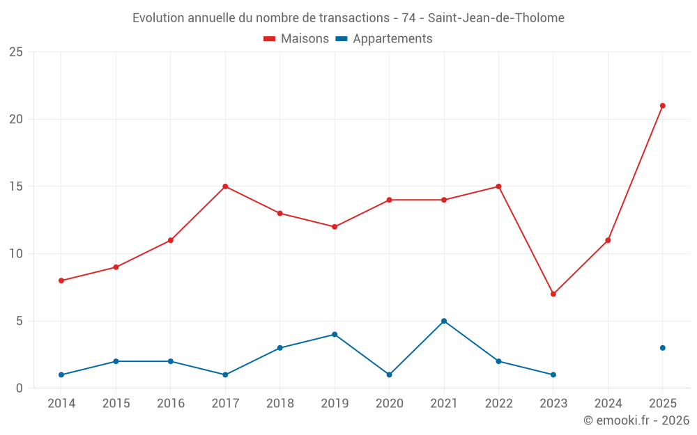 Le prix médian sur les 21 transactions de maisons des 12 derniers mois dans la commune de Saint-Jean-de-Tholome était de 3 164 € par mètre carré pour une valeur foncière médiane de 408 700 €. Sur cette période 60% des transactions se sont situées entre 2 381 et 4 592 € par mètre carré (du 2ème au 8ème déciles).