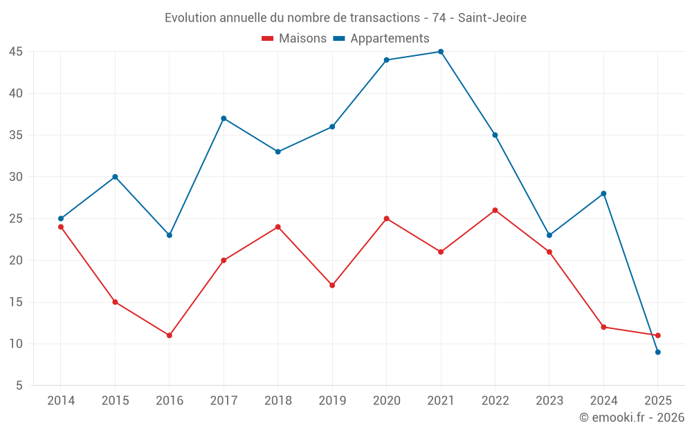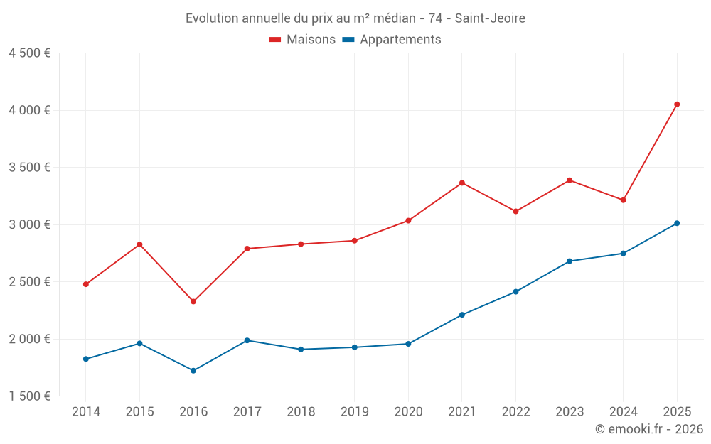 Le prix médian sur les 18 transactions de maisons des 12 derniers mois dans la commune de Saint-Jeoire était de 3 788 € par mètre carré pour une valeur foncière médiane de 319 450 €. Sur cette période 60% des transactions se sont situées entre 2 184 et 5 214 € par mètre carré (du 2ème au 8ème déciles).