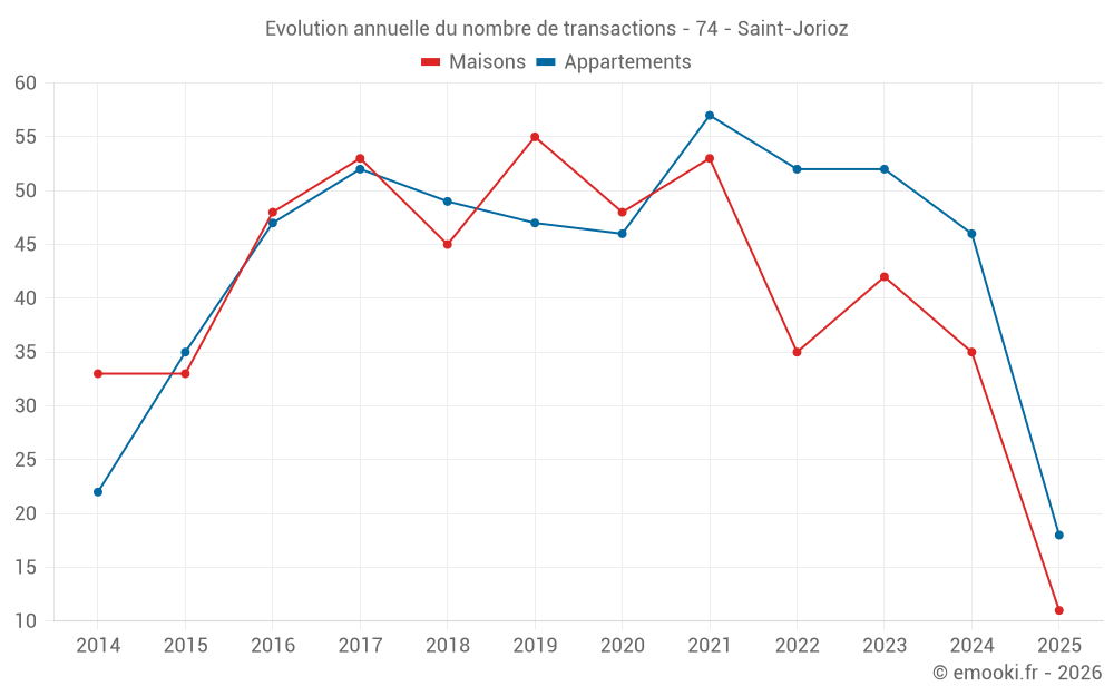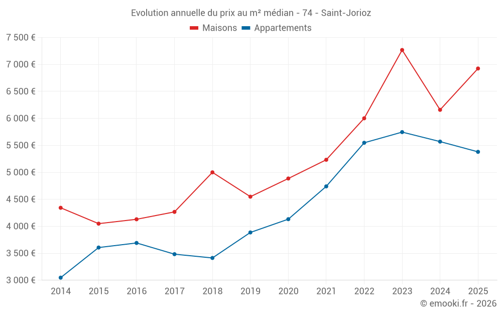 Le prix médian sur les 28 transactions de maisons des 12 derniers mois dans la commune de Saint-Jorioz était de 6 318 € par mètre carré pour une valeur foncière médiane de 833 300 €. Sur cette période 60% des transactions se sont situées entre 5 514 et 7 841 € par mètre carré (du 2ème au 8ème déciles).