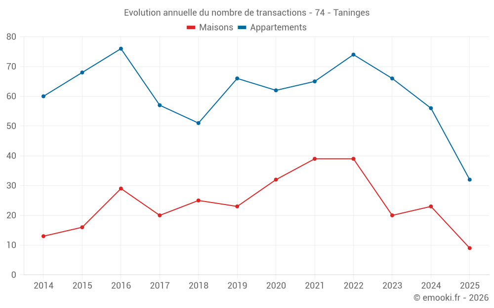 Le prix médian sur les 25 transactions de maisons des 12 derniers mois dans la commune de Taninges était de 4 000 € par mètre carré pour une valeur foncière médiane de 390 000 €. Sur cette période 60% des transactions se sont situées entre 3 062 et 7 005 € par mètre carré (du 2ème au 8ème déciles).
