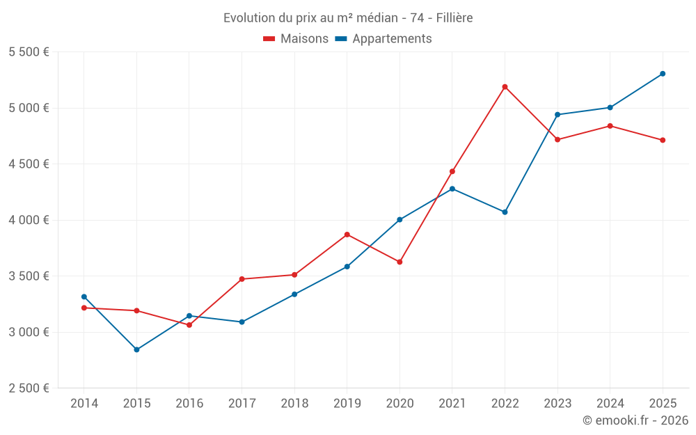 Le prix médian sur les 37 transactions d'appartements des 12 derniers mois dans la commune de Fillière était de 5 103 € par mètre carré pour une valeur foncière médiane de 327 500 €. Sur cette période 60% des transactions se sont situées entre 3 492 et 5 759 € par mètre carré (du 2ème au 8ème déciles).