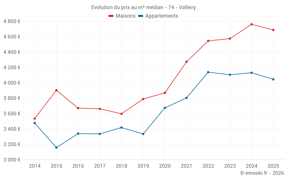 Le prix médian sur les 16 transactions de maisons des 12 derniers mois dans la commune de Valleiry était de 4 869 € par mètre carré pour une valeur foncière médiane de 484 350 €. Sur cette période 60% des transactions se sont situées entre 4 115 et 5 486 € par mètre carré (du 2ème au 8ème déciles).