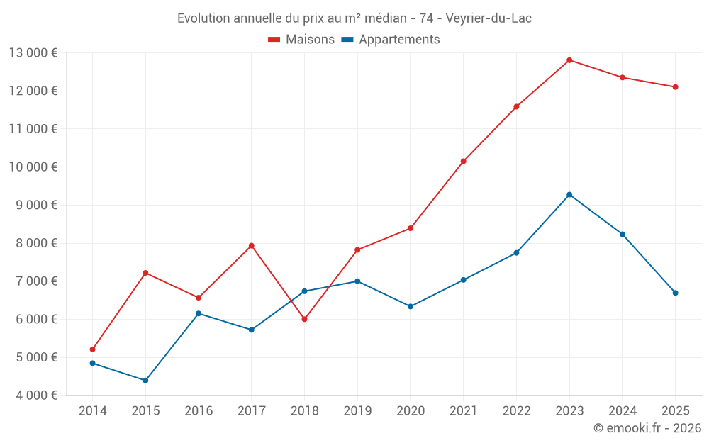 Le prix médian sur les 32 transactions de maisons des 24 derniers mois dans la commune de Veyrier-du-Lac était de 12 078 € par mètre carré pour une valeur foncière médiane de 1 536 810 €. Sur cette période 60% des transactions se sont situées entre 8 436 et 14 825 € par mètre carré (du 2ème au 8ème déciles).